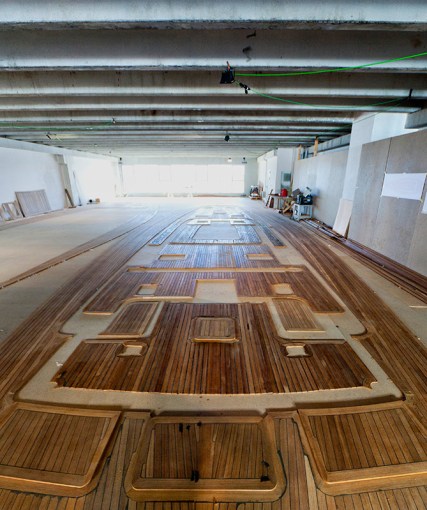 Line UPOcean Refit has over 2,000 metres of working floor space so there are no yacht size restrictions. This includes a purpose-built 350 square metre carpentry workshop with a dedicated teak decking prefabrication loft measuring 40m long. To produce the highest possible level of accuracy we use a portable 3D laser measuring device which enables us to re-construct your deck as a three dimensional model using computer aided design. From here we can showcase various options for style, design and finish for your yacht. We prefabricate teak decks in-house at our workshop, laying out individual sections which are then dismantled and transported to the yacht for rapid installation with modern vacuum pressing technology. Ocean Refit work with only the highest quality teak available and in conjunction with world renowned Teak Decking Systems of Florida.